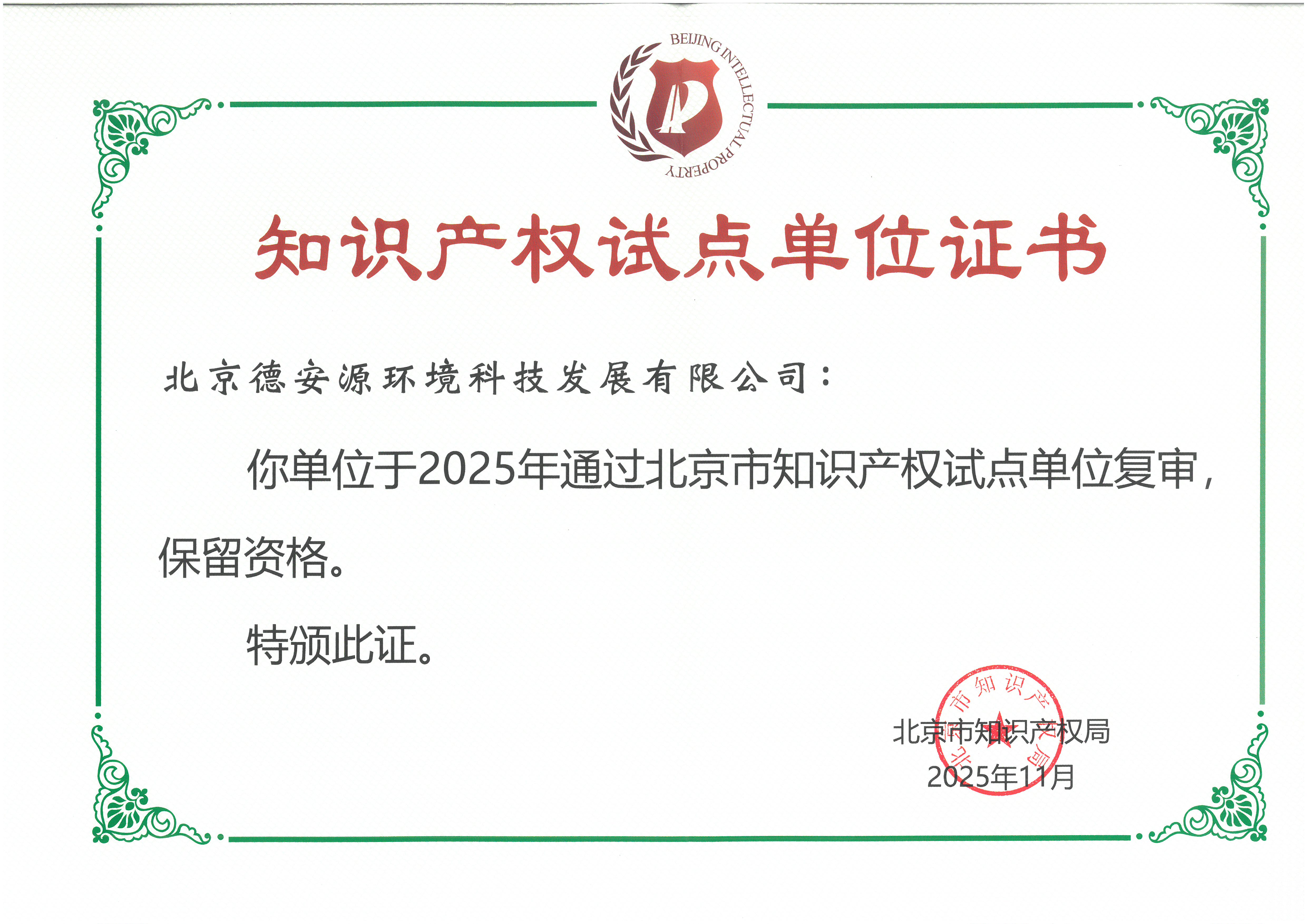 知识产权试点单位证书
